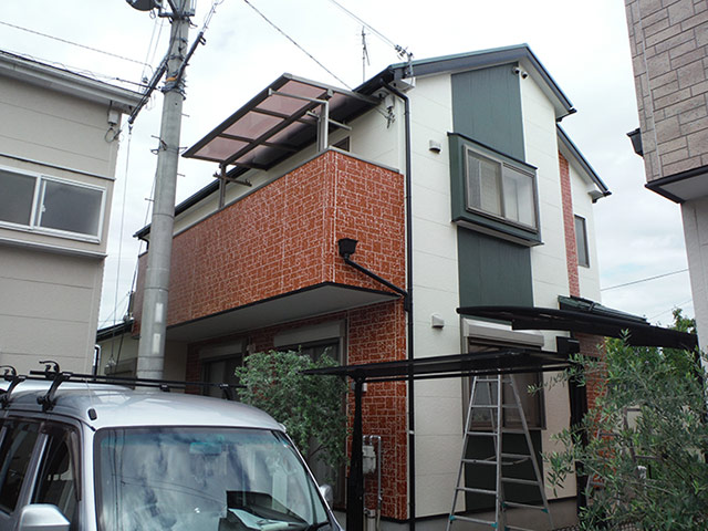 近くて信頼できる塗装屋さんにお願いしたいとご依頼いただきました。幹線道路沿いのお宅ででしたので全体がかなり汚れて、雨戸などはかなり色むらが出ている状態でした。しっかりけれんと高圧洗浄を行い丁寧に塗装していきました。1Fに一部雨漏りしている箇所がありましたので、考えられる原因をすべて補修して仕上げました。