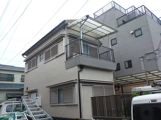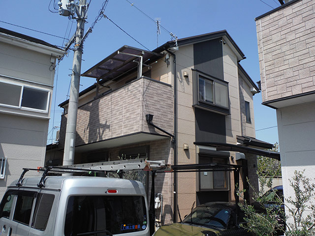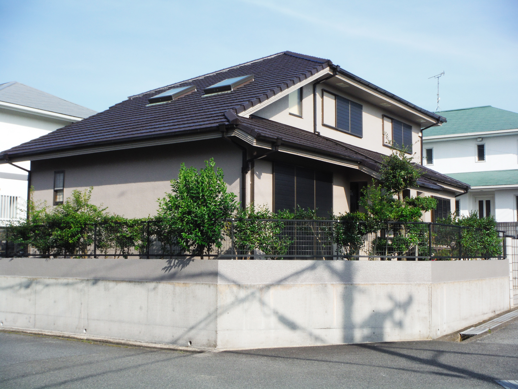 以前に塗装した歯科医院の院長様のお宅でした。外壁は総タイル貼りのお宅でしたが、シーリングの打ち替え工事をお願いされました。ついでに軒天や付帯物の塗装も行いました。作業を進めていくとベランダの手すりが内部に水が回り腐っていたりタイルが剥離しかけている箇所や割れてしまっている部分が有ったり、ベランダテラスの強化ガラス屋根が割れていることなどを見つけましたのでそれらも大工さんやタイル屋さんに直していただきました。 - お客さまの声