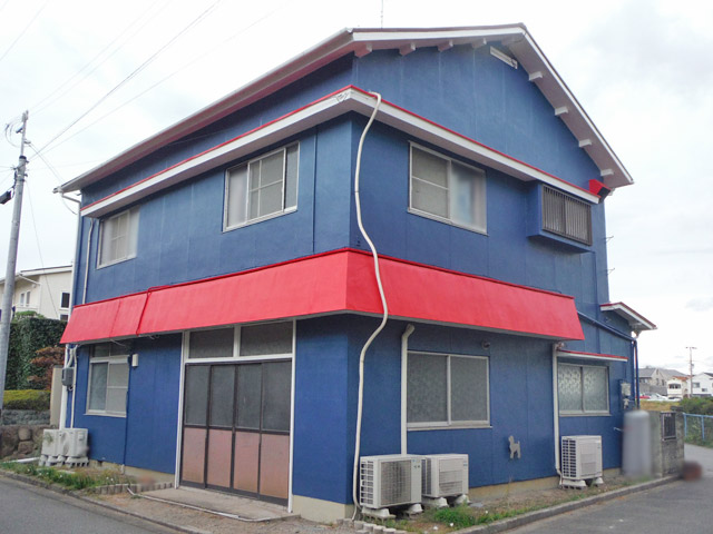 - 大工さんの仕事でした。古い家屋をペットショップに改装する工事でした。色が原色に近く当初は水性で塗装する予定でしたが、水性塗料で作ると溶剤より高額になるので溶剤シリコンで施工することになりました。個性的な建物に仕上がりました。