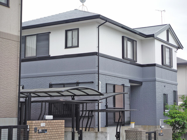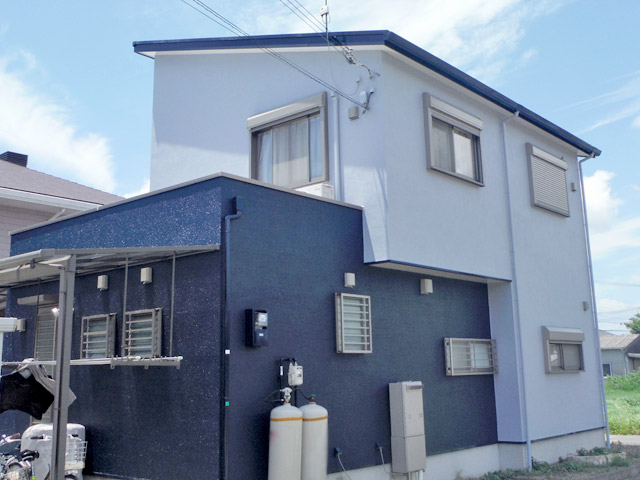 - 我が家の塗装です。塗装屋の家があまり汚い状態ではよくありませんので、数年前から塗装を行いたいと考えていたのですが、忙しい日が多く中々自分の家は後回しになっていました。ただ築12年になりもう後回しには出来ないと思い、現場の合間合間で施工しました。妻がメインで色を決めました。以前の色はアースカラーでしたので、今回はモダンシャープな感じに仕上げたいとの思い(写真では解り難いですが)少し赤みの入ったブルー系の色でまとめました。かなりのイメージチェンジになりました。