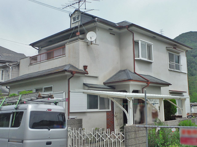 - 外壁の剥離がありましたので、一旦剥がれなくなるところまで剥がして、カチオンフィーラー、シーラー、ボンタイル吹付の順に下地処理し上塗りを行いました。庇の板金なども錆て穴が開いていましたので補修して塗装しました。とてもきれいになりました。