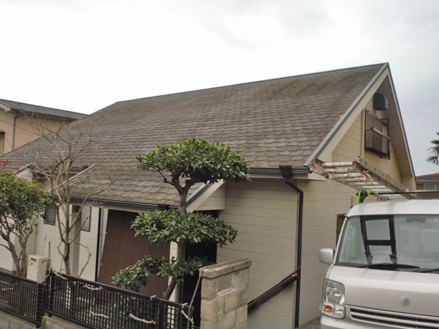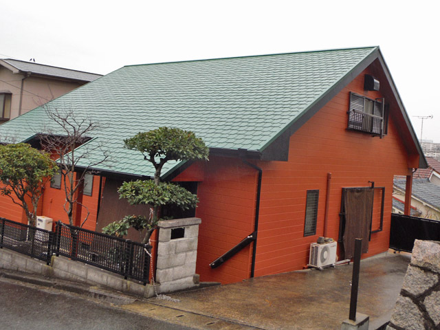 - 最初は屋根のみの塗装の依頼でした、外壁も痛みが進んでいましたので外壁も塗装することになりました。自然の木のイメージの色を依頼されましたので、何種類か提案させていただき選んでいただきました。軒樋に落ち葉除けも取り付けました。