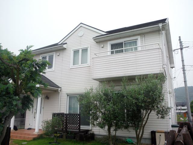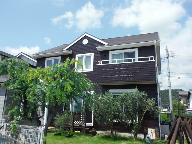 - 施主様が近くにあるログハウスの喫茶店の雰囲気を気に入っておられて同じような感じにしてほしいとお願いされました。使用しているサイディングが板を横張りにしたようなログハウス調の物でしたので同じような再現が出来ました。屋根は少し濁ったようなブラウンで塗装しとても綺麗に仕上がりました。最初の色とガラッと変わりましたので大きくイメージチェンジ出来ました。