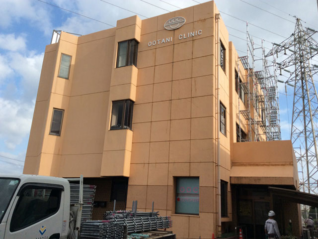 - 本来は10月中に行う予定でしたが、駐車場の舗装工事を急に行う事になり足場架設を中断して一月ほど延期することになりました。色は最初現状と同じ感じを依頼されましたが、せっかくの塗装なのでワンポイント付けることをお勧めしたところ写真のように縦にラインを入れるようなデザインを希望されました。また屋上の防水に大きな穴が開いていることを発見しましたさらに防水層が全体に傷んでいましたので、防水をやり直しました。