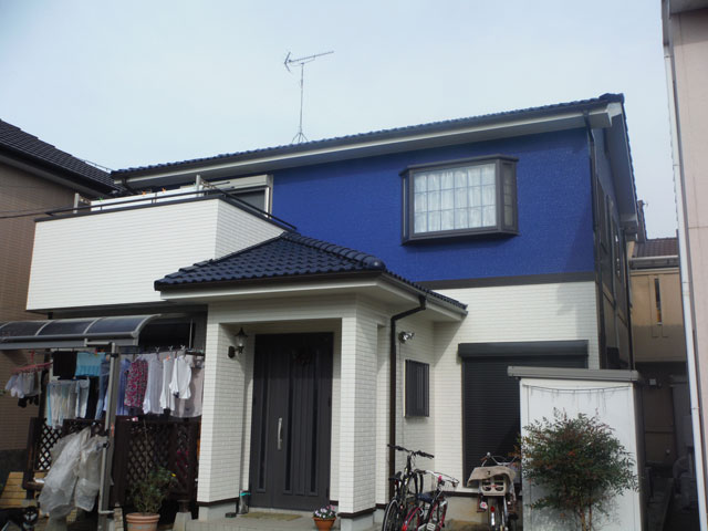 - 配色で幾度も打ち合わせを行い決定しました。1Fのダブルトーン施工も何種類か実際に外壁を試し塗りを行い決めて頂きました。屋根も追加でクリアーコートを塗布しました。おかげでモニュエル瓦ですがきれいな艶が出ました。近所にあまりない色を塗りたいとの希望でしたがとても目立つ色になったと思います。