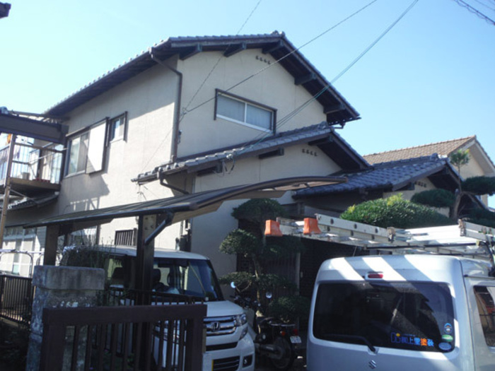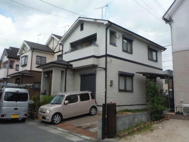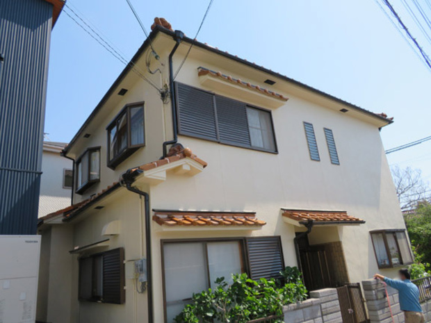 2019年12月に施工したT様からのご紹介でした。阪神淡路大震災のすぐ前に建てられたお宅で、震災後すぐの補修工事と15年位前に一度塗装歴があるお宅でした。その後もクラックの補修などをしておられ、コーキングがそのままでした。その跡が気になるのと、前の塗装から時間がたっているので今回施工を依頼されました。樋や棟包みに台風の被害が見られましたので、火災保険の申請もしましたが、残念ながら認定はされませんでしたが、その分しっかり補修し下地処理を行いました。左官のやり替えなども行いしっかり施工することが出来ました。