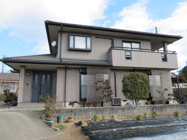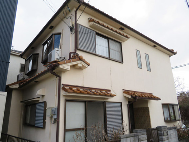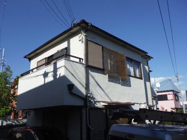 新築で建ててから30年近く何もしていないお宅でした。クラックがかなり発生しており、ご自分でコーキングやモルタルで補修しておられました。雨漏りもしているとのことで、調査しましたが屋根材が台風で飛んでしまい2枚ほど無くなっていました。