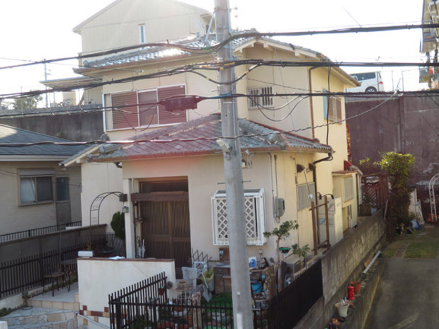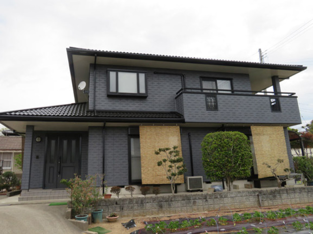 JRの線路のすぐ近くでしたので、JR西日本架線事務所に問い合わせて申請書と許可書を作成ししっかり事務手続きを行ってから工事に入りました。施主様に聞くとご近所で何軒か塗装工事をしたけどそんなことをしている家はなかったとおしゃってましたが何かあってからでは遅いので、JRに確認して必要だという事がわかりましたのでしっかり手続きを行いました。樋や棟包みに台風被害が有りましたので火災保険の申請もしました。100万円近い保険金が認定され破損部分の補修を行いました。色は娘さんを含めて家族でかなり悩んだようですが、特に娘さんが気に入っている様です。