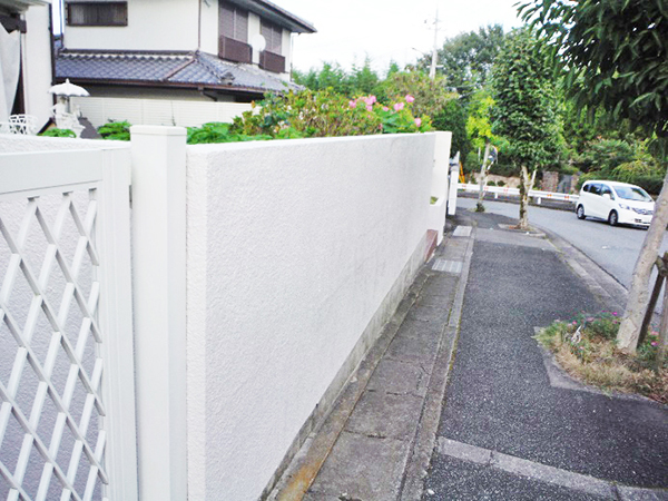 塀や玄関ドアの塗装のみの依頼でした。塀は専用塗料を使用して塗装しました。塀などは地中からの水分を吸い上げたりや天端に降り注いだ雨などが染み込んでいくため、その水分を逃がすような塗料で塗る必要が有ります。外壁に塗るような塗料で塗ると、入った水分が逃げ場を無くして塗膜の膨れや剥離の原因になります。