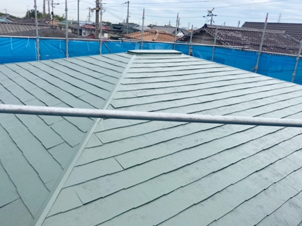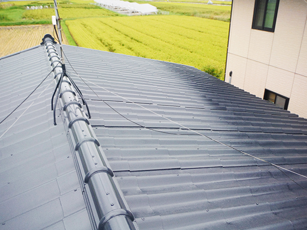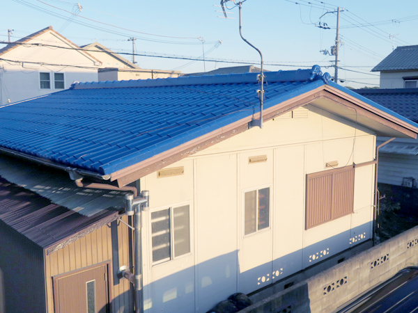 今回は屋根だけの塗装でした。足場も組みませんでしたので、安全に十分配慮して施工しました。高圧洗浄時も近隣に汚水が飛び散らないように配慮し、二人で養生シートで防御しながら一人が洗浄する方法でおこないました。